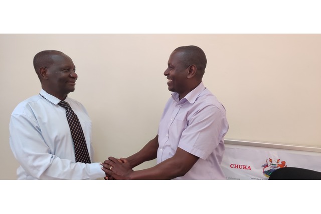 Prof. Christopher Kiboro, Dean of the Faculty of Humanities and Social Sciences, paid a courtesy visit to the newly elected Chair of the Department of Humanities, Prof. Dickson Nkonge, to officially welcome and congratulate him on his new leadership role.